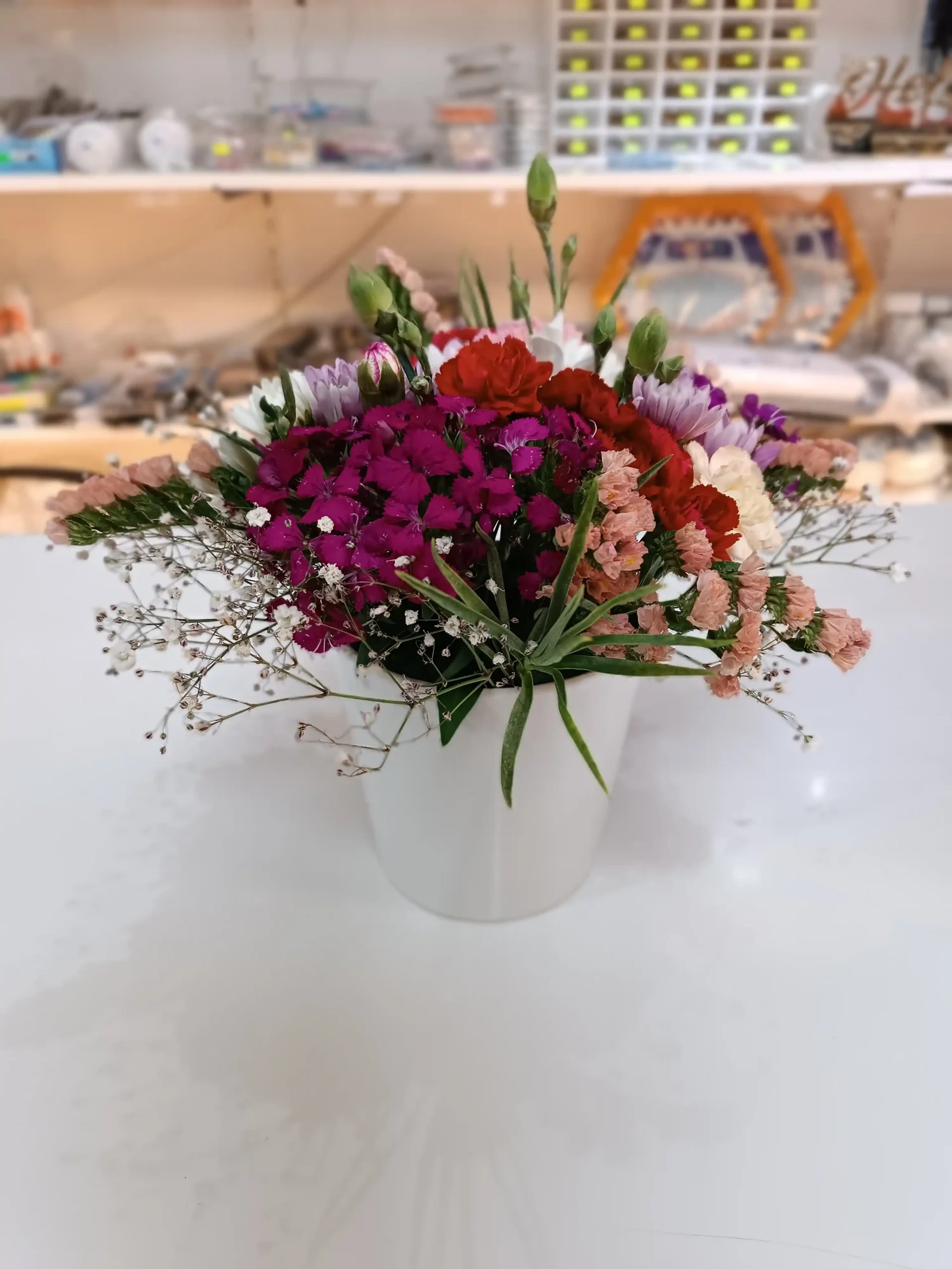 Beyaz Vazoda Rengarenk Çiçek Demeti