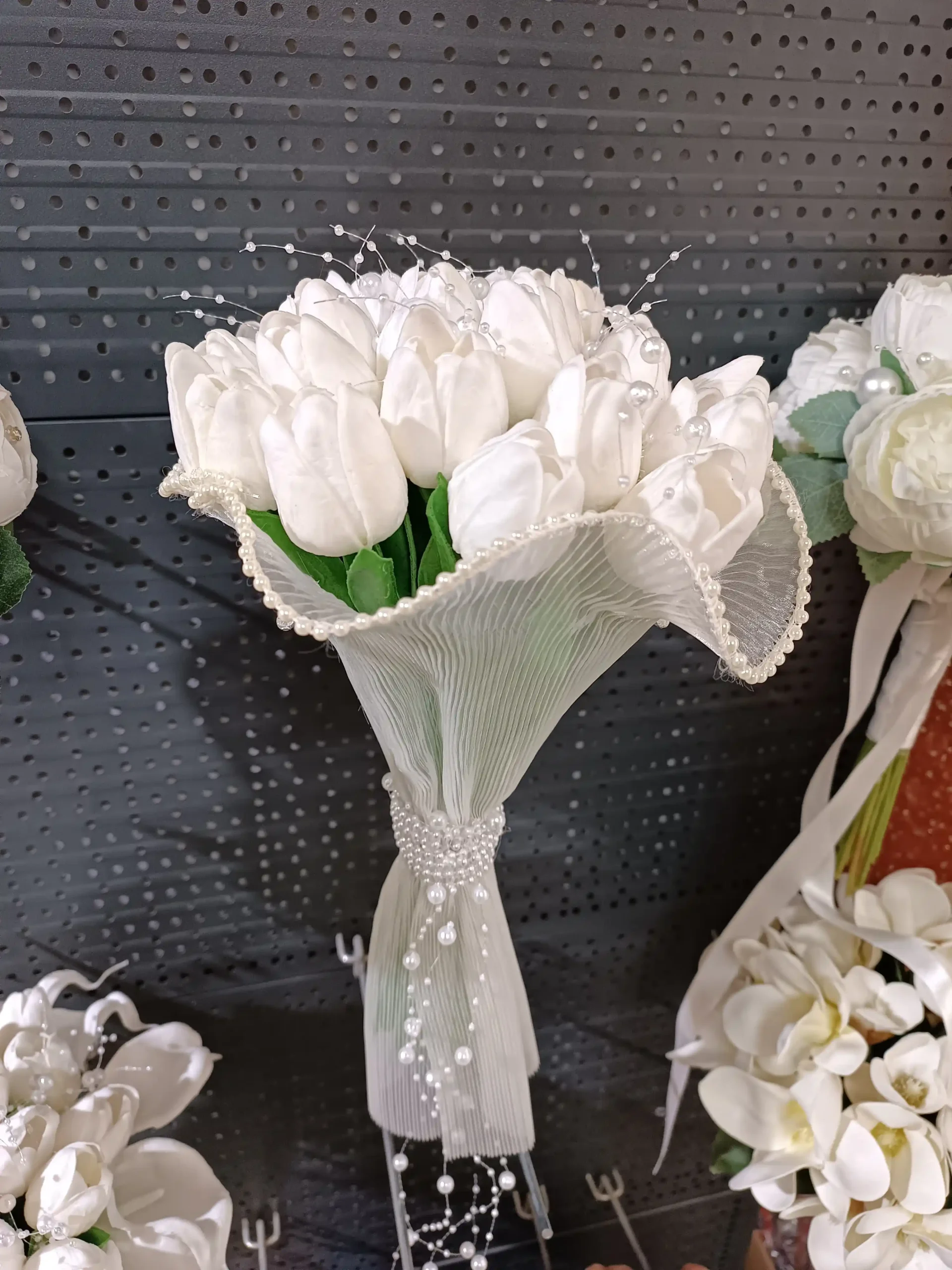 Beyaz güllerle tamamlanan bu zarif buket, ince dantel detaylarıyla nostaljik ve şık bir görünüm sunar. Zamansız estetiğiyle özel günlerde duyguları en zarif şekilde ifade eder. Hem romantik hem de klasik atmosferler için mükemmel bir seçimdir.